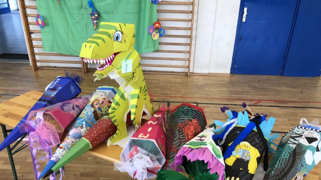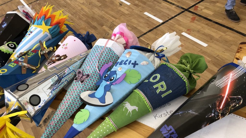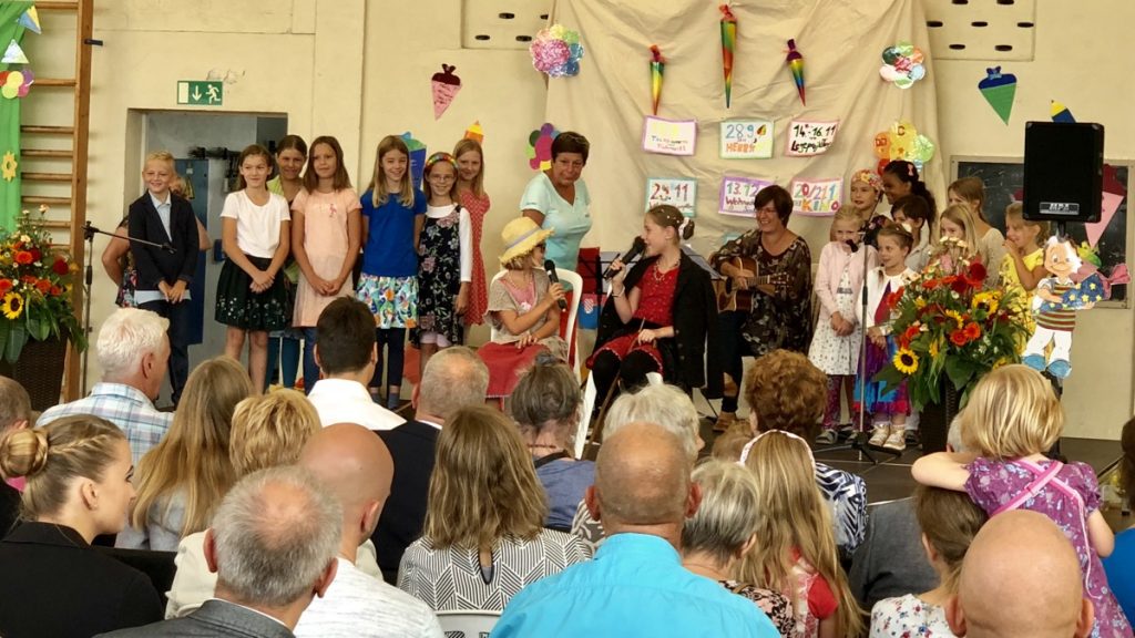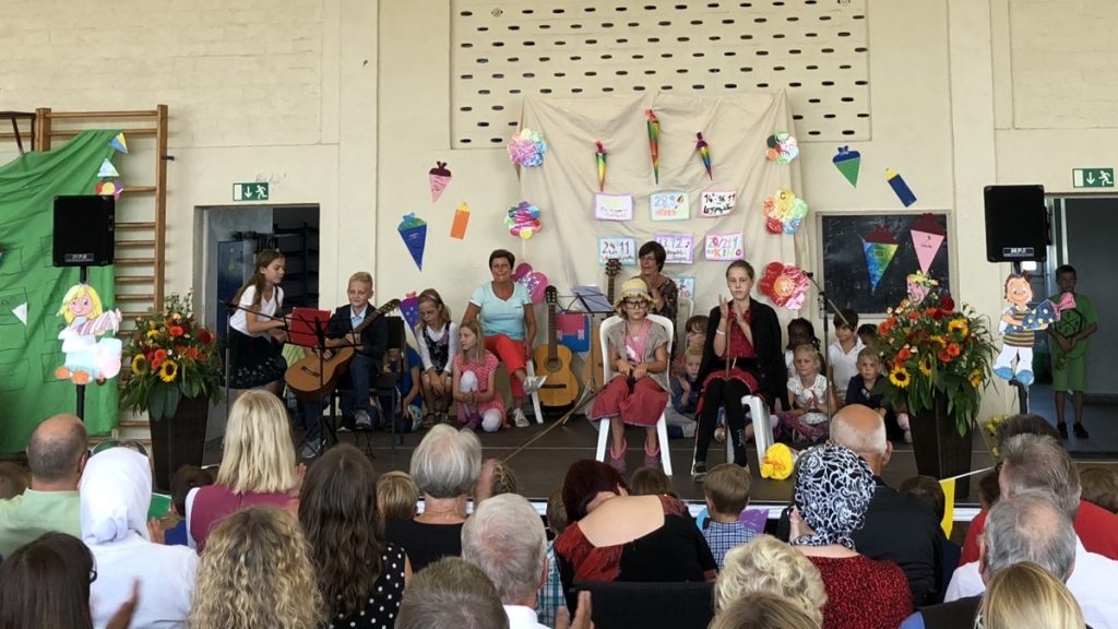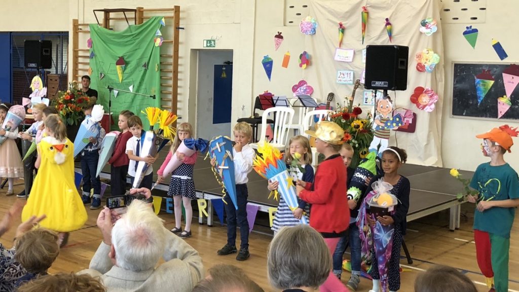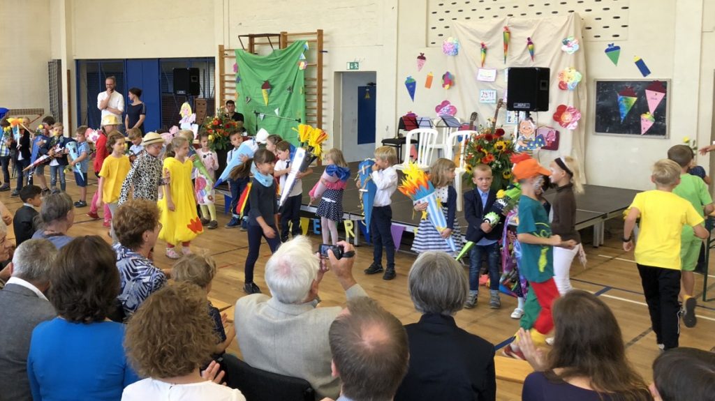 Nach dem Einzug der Kinder in die Turnhalle präsentierten Frau Müller und Frau Kubitschek-Walch mit Kindern der höheren Klassen ein musikalisches Unterhaltungsprogramm. Anschließend bekamen die Kinder ihre Schultüten aus der Hand ihrer neuen Erzieherinnen und Klassenlehrerinnen. Die älteren Kinder schenkten dann jedem neuen Schulkind noch eine gelbe Rose. Den Blumenschmuck hatte der Förderverein organisiert.