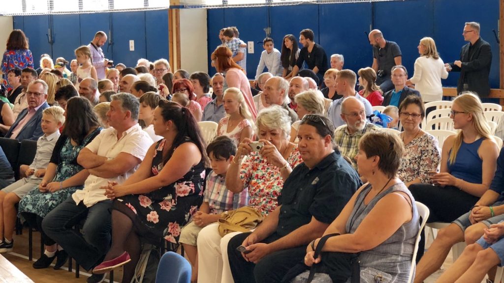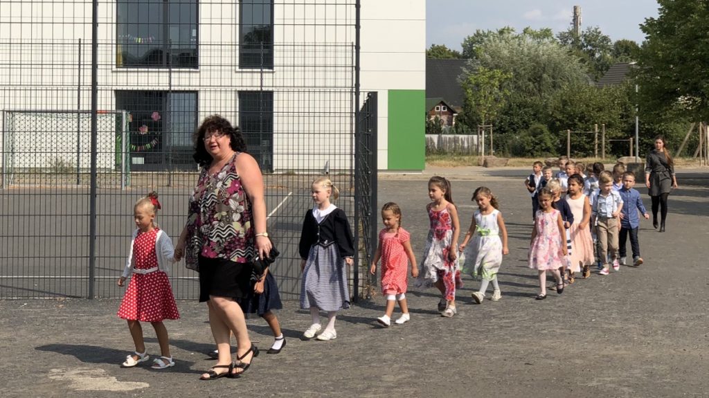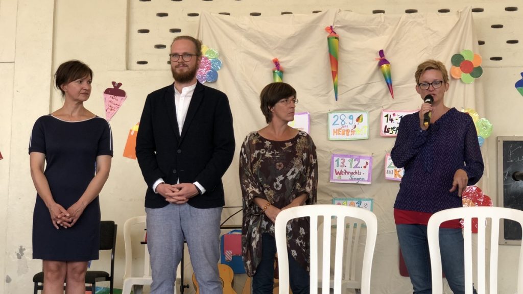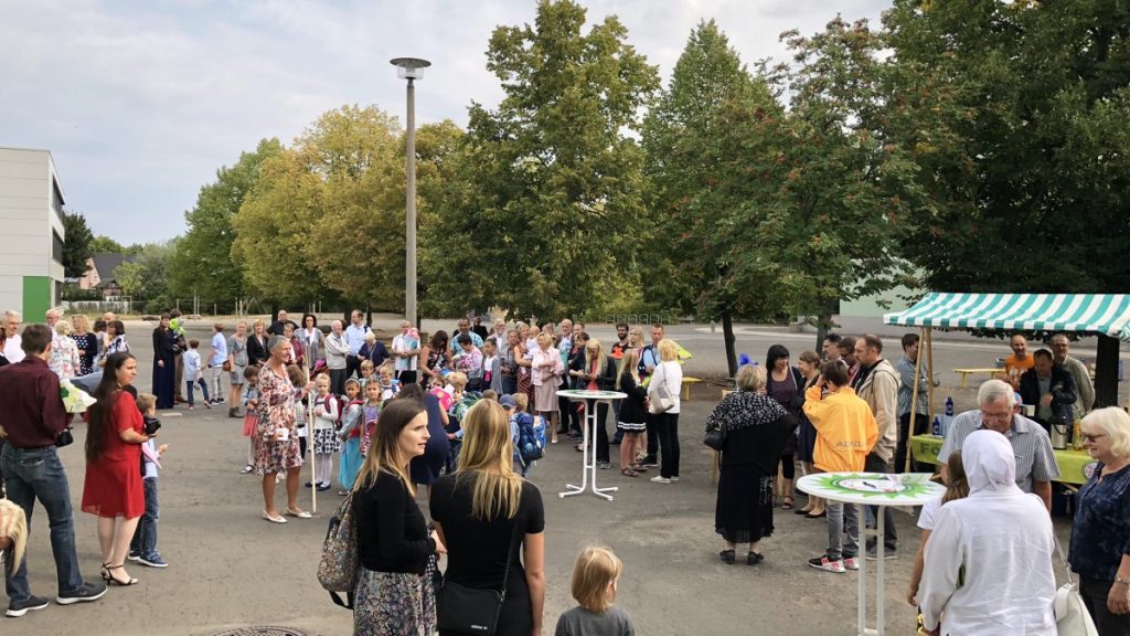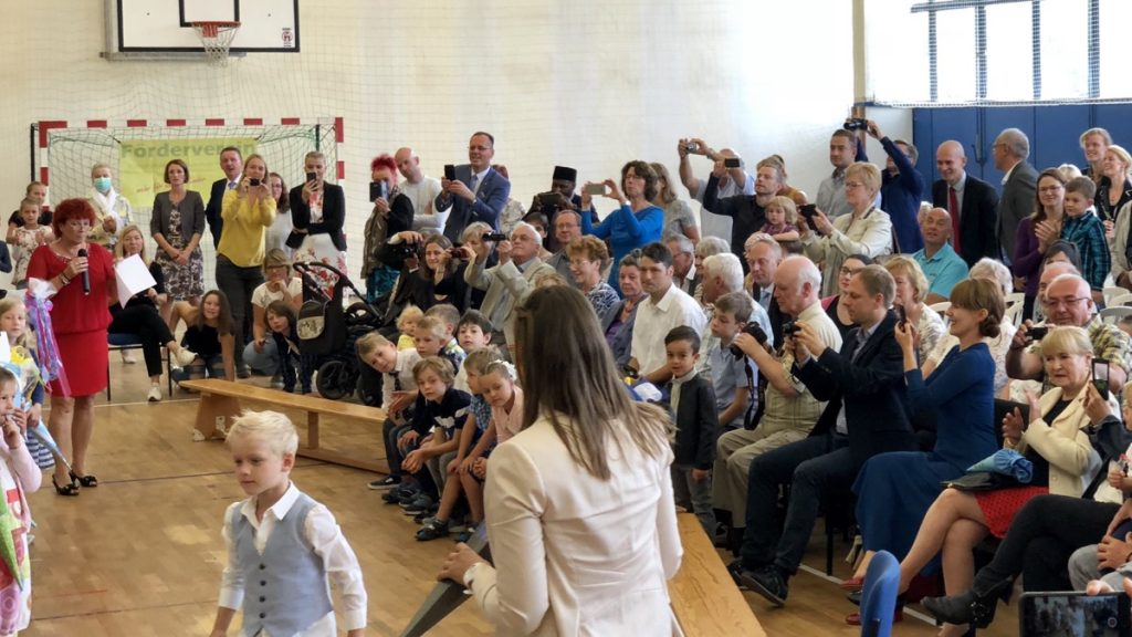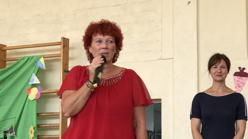 Am ersten Samstag im neuen Schuljahr werden traditionsgemäß die Erstklässler eingeschult. Zum ersten Mal gingen in diesem Jahr nur noch altershomogene Klassen an den Start. Auf dem Schulgelände in der Kastanienallee wurden hintereinander drei Klassen eingeschult. Die Turnhalle der Schule war mit den teilnehmenden Eltern und Großeltern jeweils gut gefüllt und die Akustik war mit weniger Besuchern auch besser zu regeln als in den Vorjahren. Während die Kinder jeweils ihre erste Schulstunde erhielten, informierten Schulleitung, Hort und Eltern darüber was sie an der Schule tun und wer Ansprechpartner ist. Für den Hort sind das Frau Müller und Herr Mozelewski, für die Eltern sind das Lara Meinunger (Förderverein) und Robert Sperling (Stellvertretender Schulelternsprecher) und für die Schulleitung Frau Zepper und Frau Gustke.