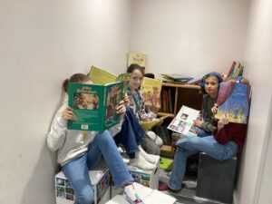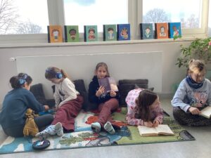 Schüler besuchen die Räume in der Bibliothek um zu lesen, zu puzzeln, Geschichten zu hören etc.